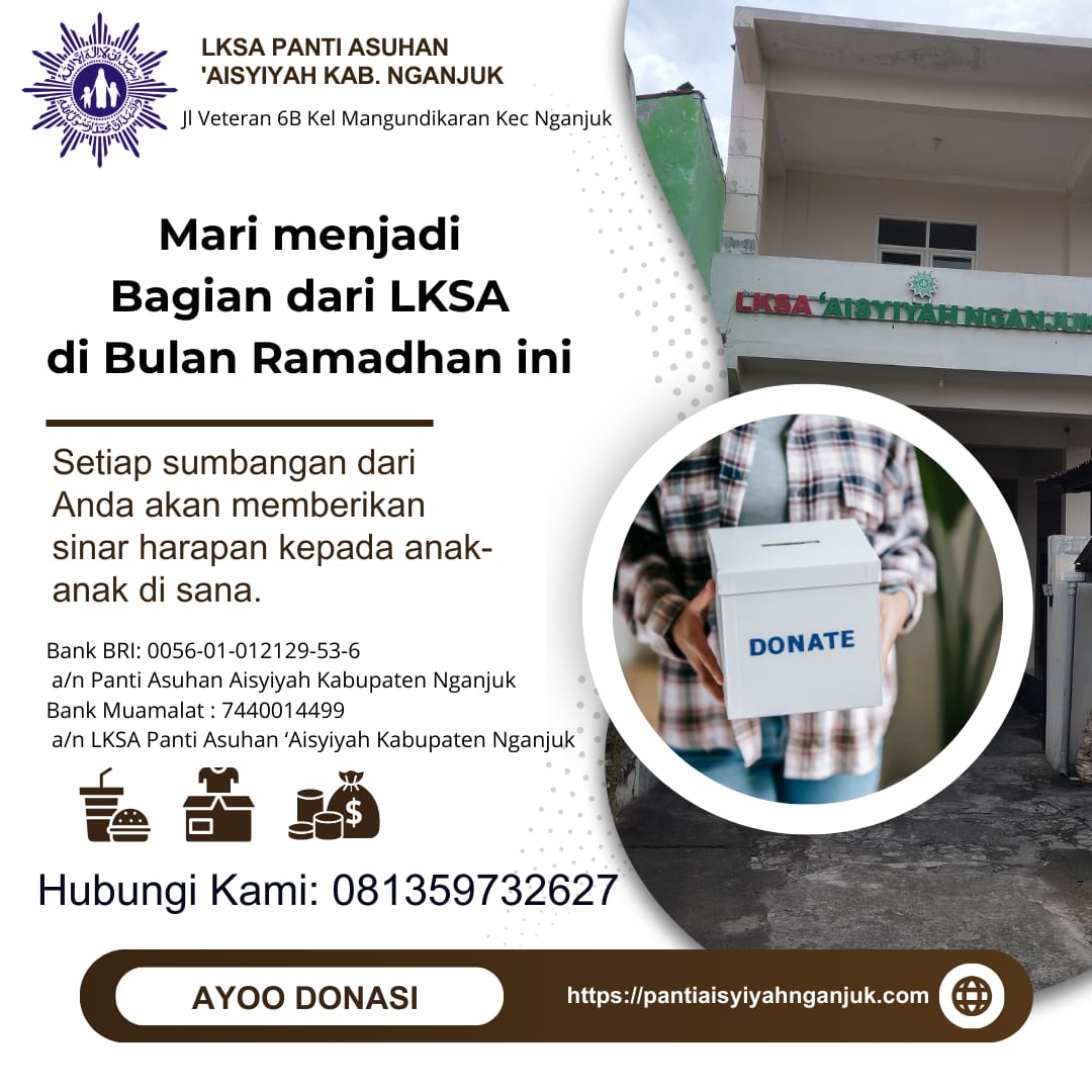 - Bank BRI: 0056-01-012129-53-6 (a/n Panti Asuhan Aisyiyah Kabupaten Nganjuk)